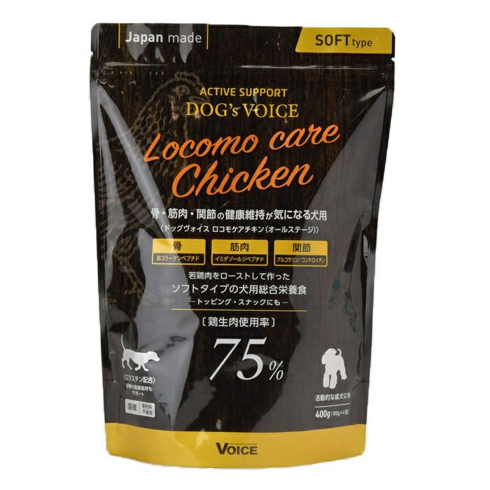 鶏肉、大豆たん白、酵母抽出物(アミノ酸含有)、ポテト、魚肉エキス(EPA、DHA含有)、油脂類(小麦胚芽油、ごま油、エゴマ油)、酵母類(亜鉛、ヨウ素、銅、パン酵母、マンガン)、乾燥酵母細胞壁、オリゴ糖、魚軟骨抽出物(コンドロイチン含有)、グルコサミン、ササ抽出物、鶏コラーゲンペプチド、チキンエキス(イミダゾールジペプチド含有)、エラスチンパウダー(魚由来)、グリセリン、ミネラル類(カルシウム、ナトリウム、カリウム、鉄)、セルロース、乳酸Na、グリシン、保存料(しらこたん白:サケ由来)、ビタミン類(B1、B2、B6、B12、C、E、ナイアシン、パントテン酸、コリン)、ポリリン酸ナトリウム、ラクトフェリン(乳由来)、クエン酸