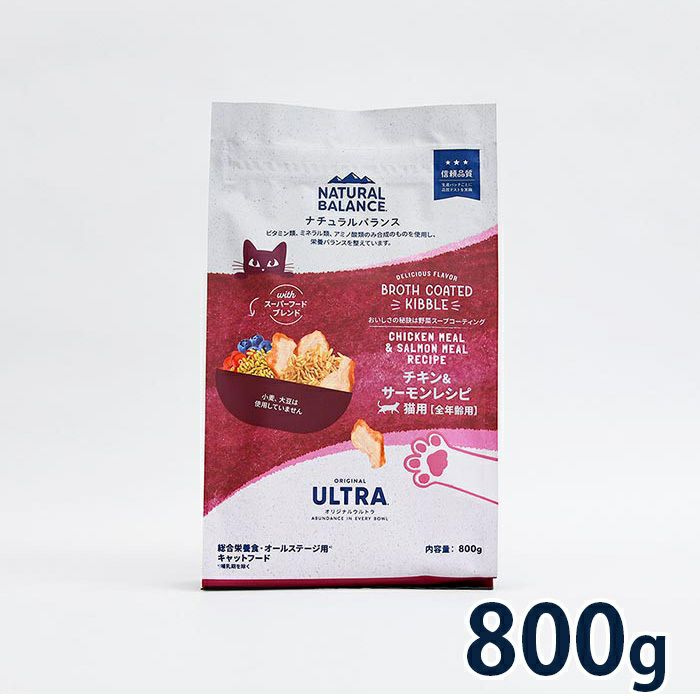 乾燥野菜スープでキブル(粒)をコーティングし、愛猫が夢中になるおいしさに仕上げました。たんぱく質源である鶏およびサーモン由来の原材料が、健康な筋肉の維持を助けます。抗酸化栄養素、ビタミン、ミネラルの良質な供給源であるスーパーフードをブレンドし、愛猫の健康を保つことで本来の免疫力の維持をサポートします。玄米やオートグローツなどに含まれる食物繊維が善玉菌の栄養源となり、腸内細菌叢を整えて健康的な消化吸収の維持を助けます。小麦・大豆は使用していません。