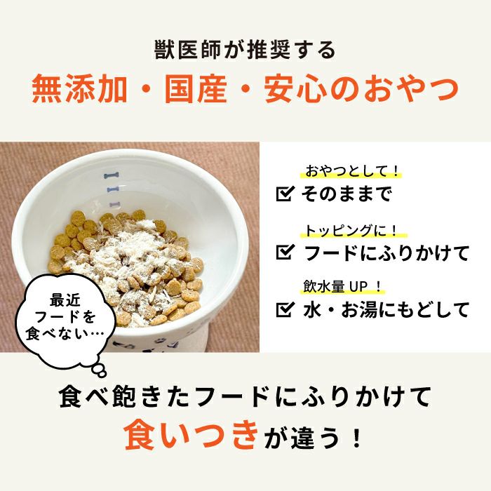 他の画像を見る ゆうパケット(宅配便同梱不可)【2個セット】ママクック フリーズドライササミふりかけ 猫用 25g(国産・無添加) 【ゆうパケット】送料無料・宅配便同梱不可 猫用 キャンセル・返品不可 盗難・未着・補償なし 代金引換不可 時間指定不可 お届け希望日選択不可 ¥ 1,596 税込 詳細を見る お気に入りに登録する